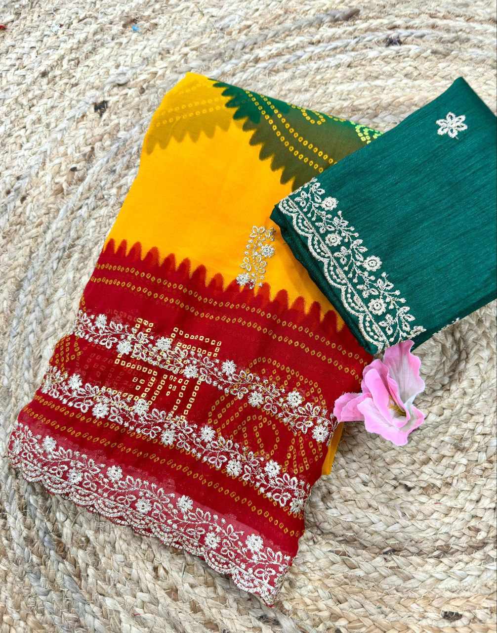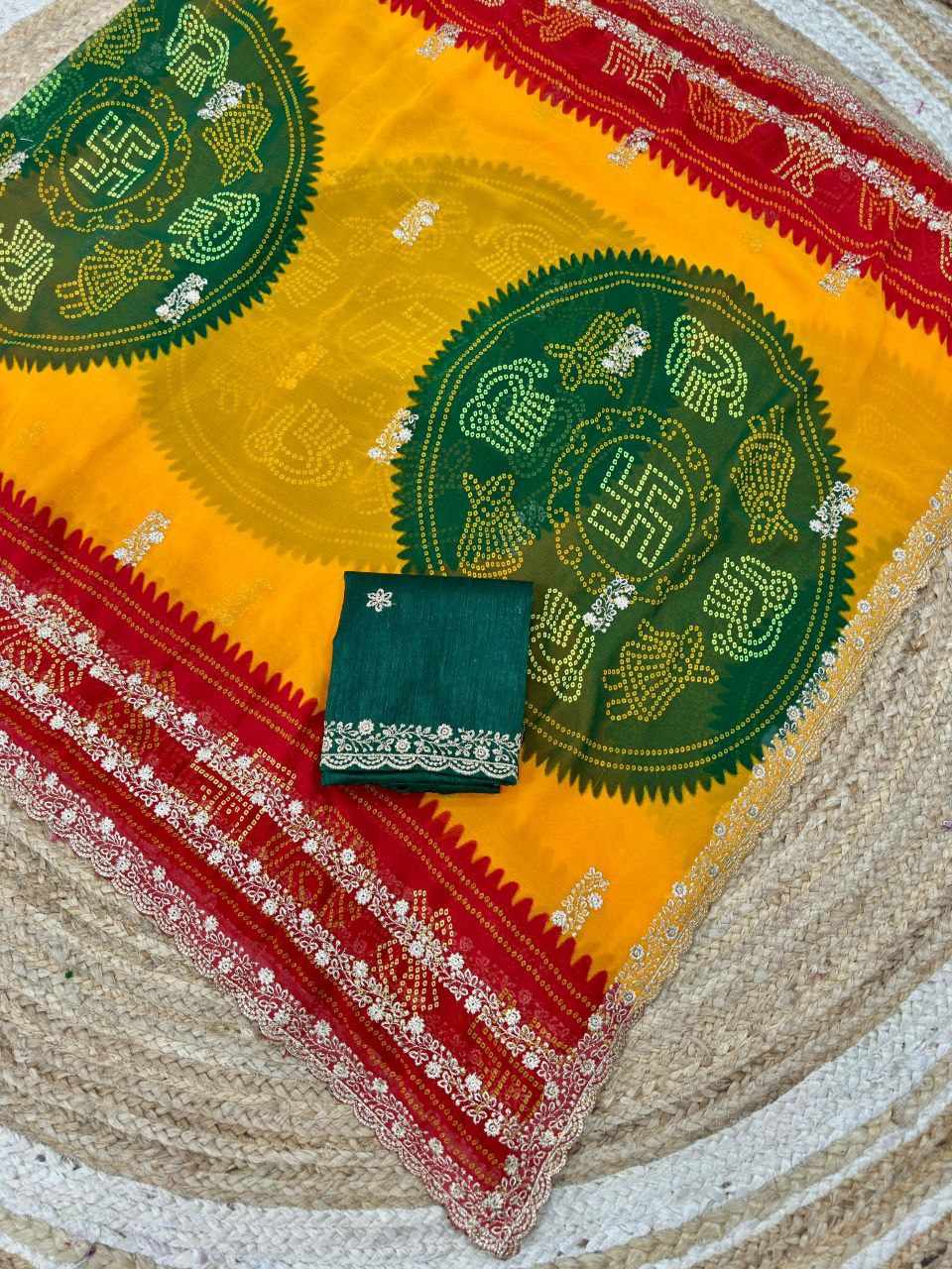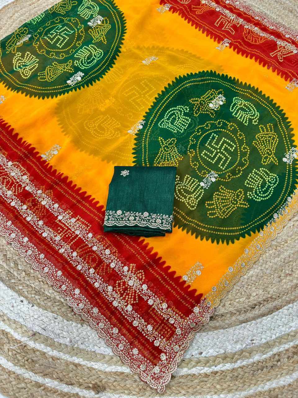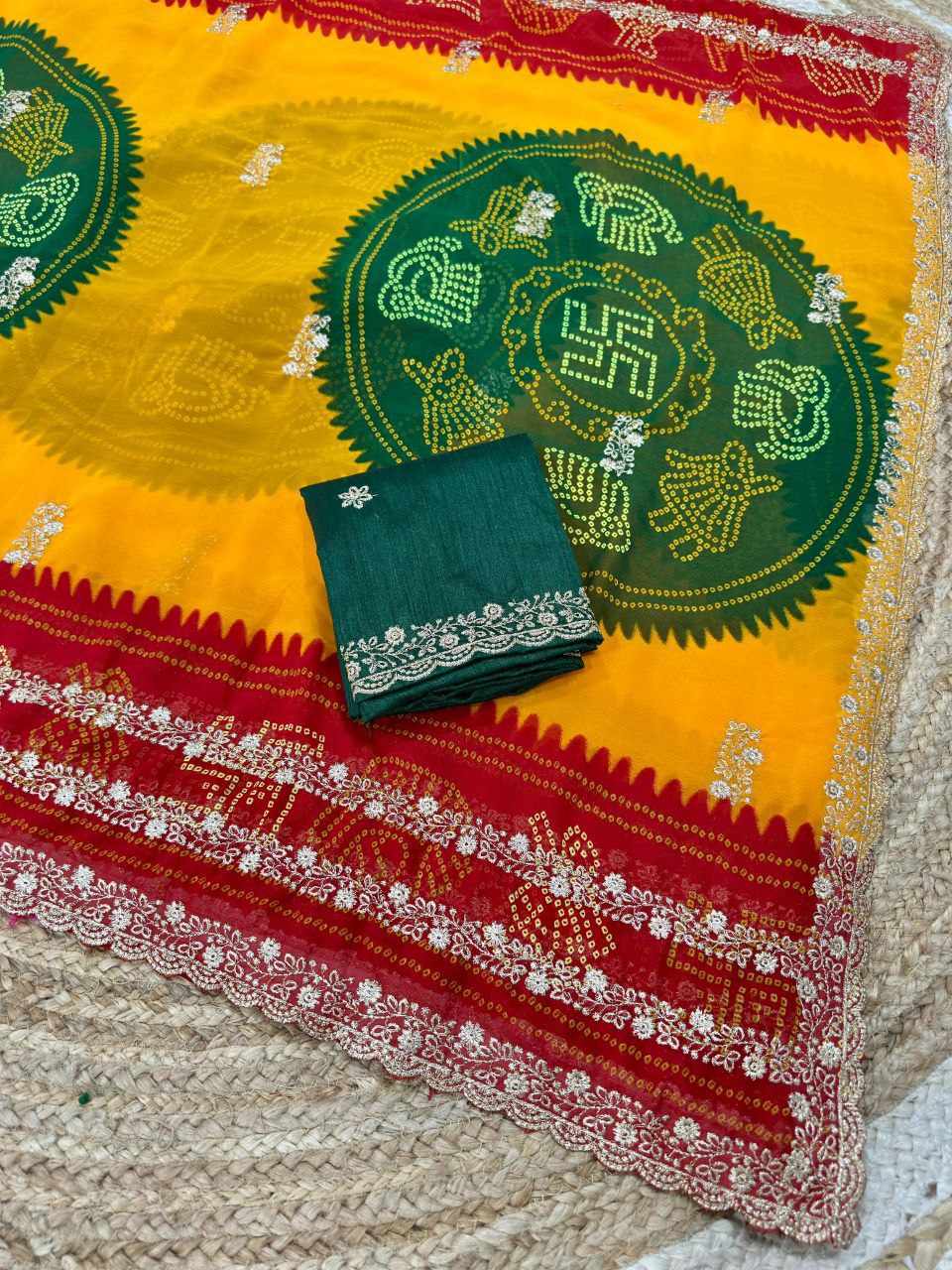 | Name : | PIYU P1052 LERIYA BANDHANI-1 Yellow-Red Saree |