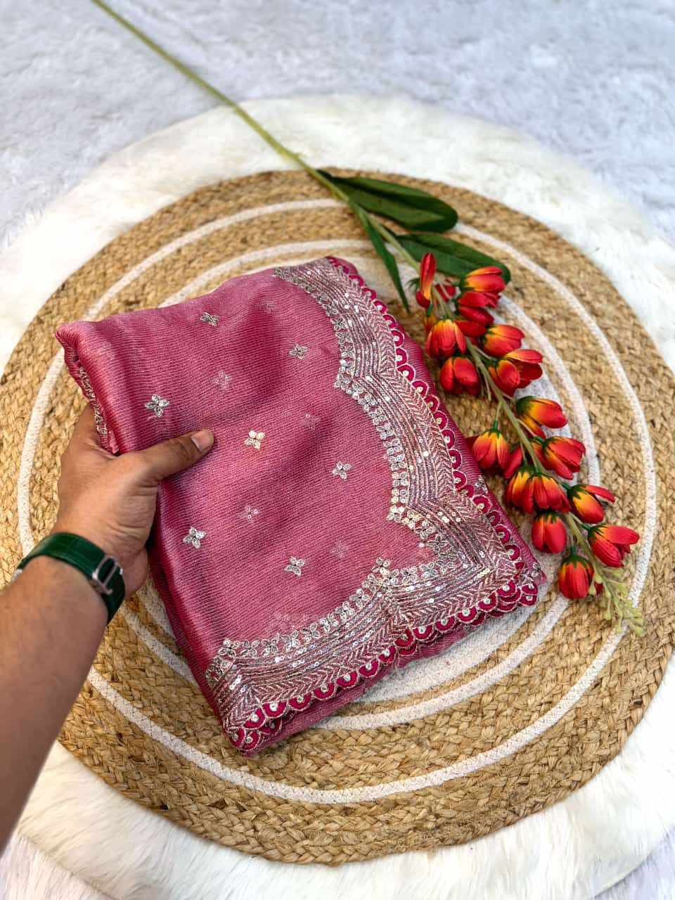 WORK: Thread embroidery lace and also zari and sequins work on all over the saree...